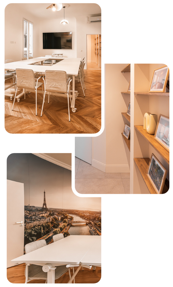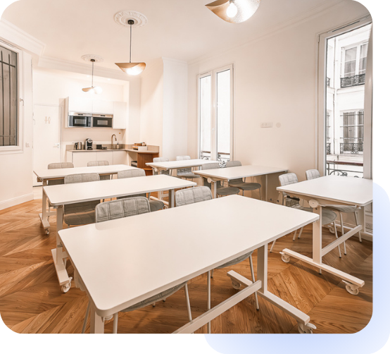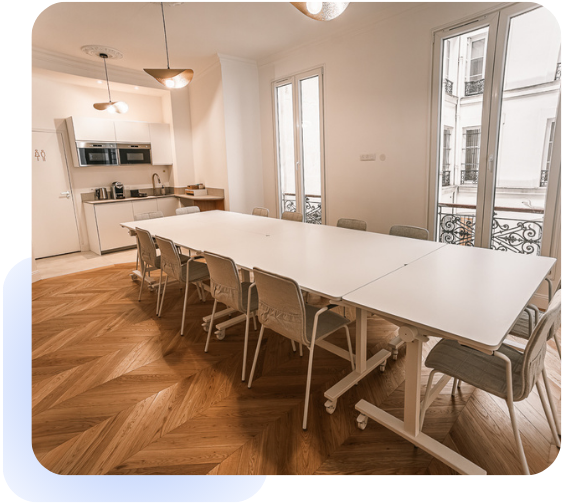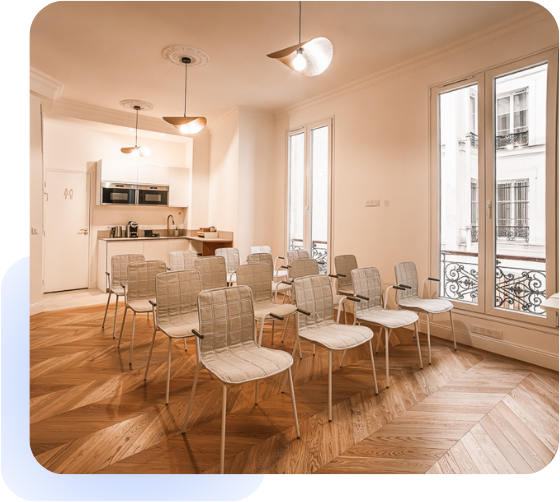 Installée au 2e étage d’un élégant immeuble parisien, elle offre un cadre professionnel agréable dans un quartier animé et recherché, à proximité de nombreux restaurants, cafés et commerces. Très bien desservie grâce aux nombreuses lignes de métro et de bus à quelques pas, cette adresse constitue un lieu idéal pour accueillir vos réunions, formations ou rendez-vous professionnels.
